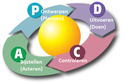 Beschrijving: De cyclus geeft de invoering van een proces weer. Allereerst wordt er een ontwerp gemaakt, dit ontwerp wordt uitgevoerd. Daarna wordt gecontroleerd of dit ontwerp wel past binnen de organisatie. Mocht dit niet het geval zijn wordt het ontwerp bijgesteld.