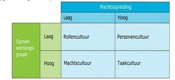 Beschrijving: Het model kan gebruikt worden om de cultuur in een bedrijf vast te stellen. Het model laat zien welke cultuur bij welke mate van machtsspreiding en samenwerkingsgraad hoort.
